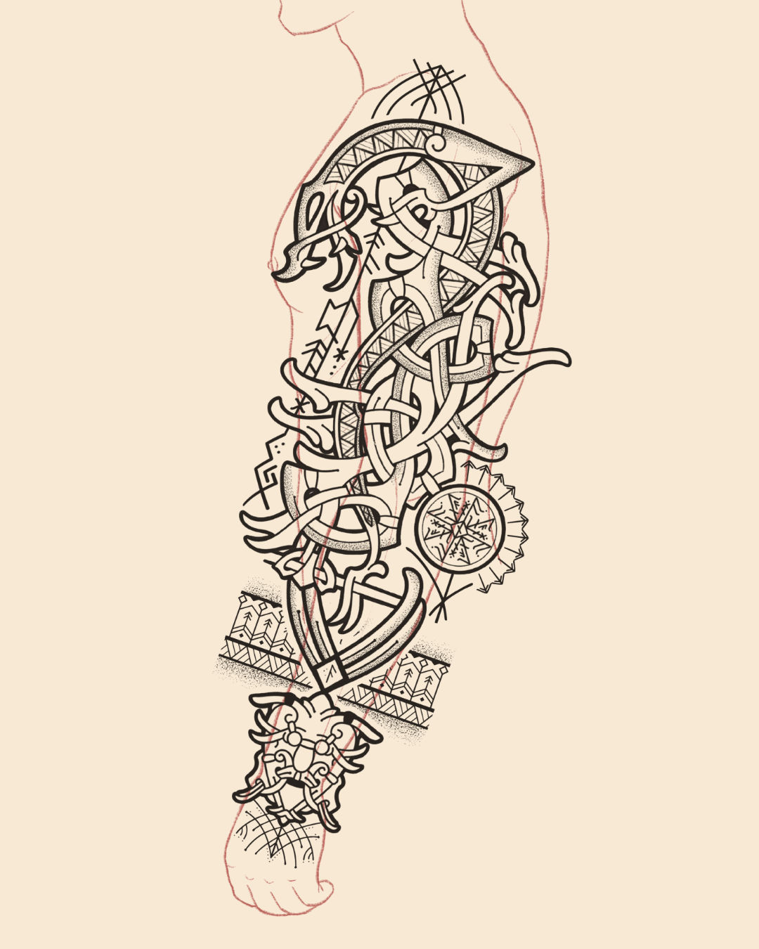 Shin tattoo — Odin godmask with sword and ornamentation wrapping around the leg.
